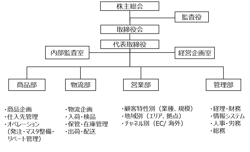 中堅規模の卸売業では、組織は「商品(仕入)」、「物流」、「営業(販売)」、「管理」 の4つの機能で構成する場合が一般的です。