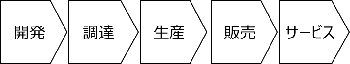 これは、製造業のプロセスが幅広い領域をカバーしていることに関係があります。以下に一般的な製造業のプロセスを示しますと、開発、調達、生産、販売、サービスと製造業が担う業務範囲が非常に広いことがわかります。さらに、製造業は伝統的に早くから市場を海外に求めることが多かったので、これらの業務がグローバル展開をしている例も多く、組織は一層複雑になる傾向があります。