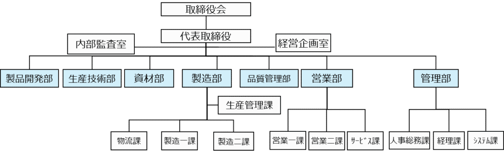 製造業の業務プロセスと組織上の部署との対応関係ならびに各部署の主要な役割を整理・解説していきます。組織形態は企業の規模、生産形態によりさまざまですが、理解を深めやすくするため、以下では製造業の典型的な組織構成例をもとに説明します。