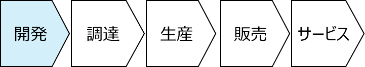 プロセスの最初にあたる「開発」を受け持つのは、組織例でいうと製品開発部にあたります。開発は、新しい製品を生み出す役割、いわば「新たな製品価値の創出」を意味します。他社ではマネのできない付加価値の高いモノを創り出せば、競争力は増し、収益に大きく貢献します。