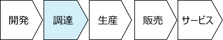 「調達」業務は、組織例においては資材部が担当します。ここでいう調達とは生産に必要な原材料を安定的に確保する活動を指します。資材部では、調達に伴う新規資材の開拓および仕入先選定、仕入先・外注先との取引条件の交渉、契約に至る業務を行います。そして、発注・仕入・支払依頼などの購買実務全般と資材在庫の管理について、資材部がその責任を担います。