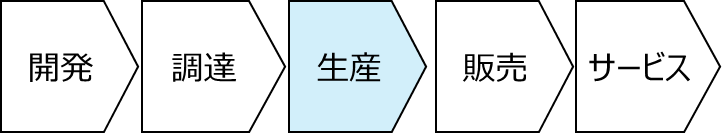「生産」プロセスは、製品の製造活動を中心とする工程であり、組織上は製造部がこれを担います。製品の生産・製造の全般を受け持ち、製造部には、製造ラインを有する各工場が所属し、実際の生産活動が行われます。組織構成としては、工場単位あるいは製造ライン単位で構成されるのが一般的です。