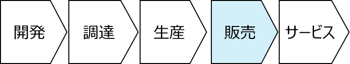 「販売」プロセスは、営業活動全般を統括する営業部が担います。営業部は営業戦略の立案に加え、マーケティング活動や販売業務全般を統括し、その成果に対する責任を負います。
