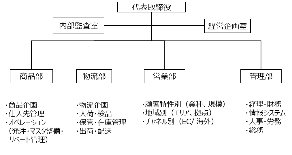 チャートの配置として、中央に事業会社が位置し、左側が仕入先、右側が顧客、下部に決済機関(銀行)、物流については上部に位置付けています。モノは左側から右側へ、お金はモノとは反対に右側から左側へ流れます。顧客・仕入先など取引先に対して、取引の窓口となる事業会社の組織・部門が対応しますが、本稿では上記フローとそれを担う組織を対応づけて、一つの例として整理します。これらの業務プロセスを担う各部門を明確にすることで、役割と責任の所在が可視化され、業務の流れと組織構造の整合性が理解しやすくなると考えたからです。以下はその対応関係を示す組織図です。