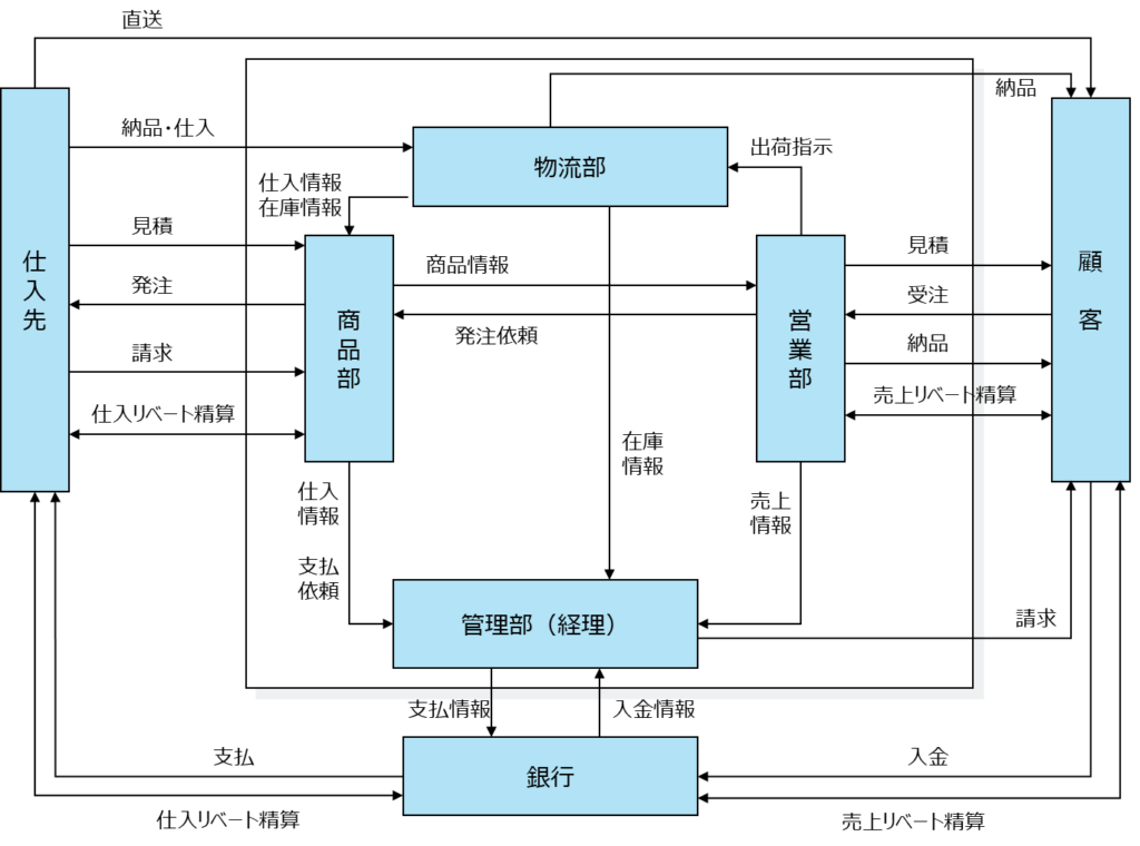 卸売業のビジネスの流れを物、金、情報に着目して、購買、物流、販売の定型業務を中心にシンプルに記述したものが次のチャートです。