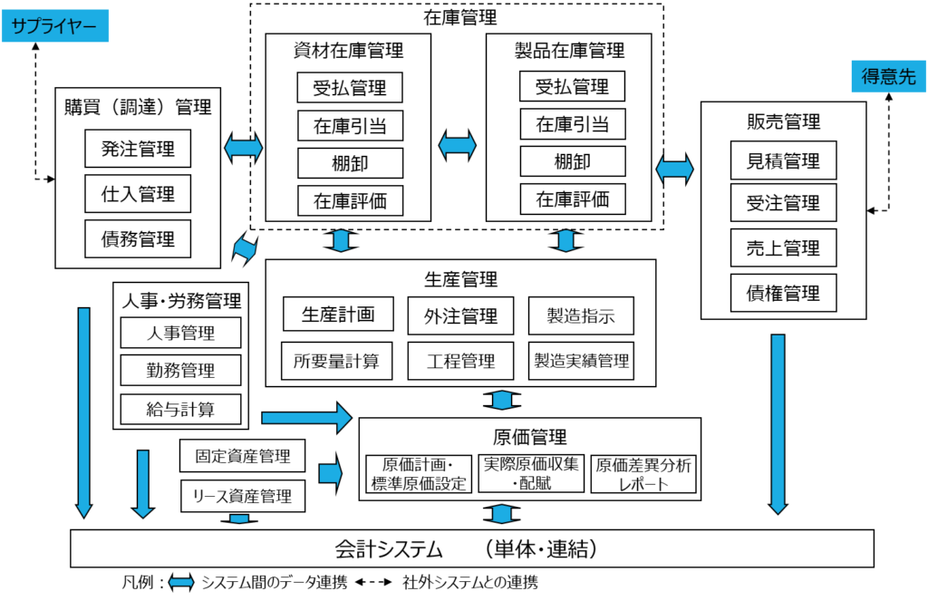 購買(調達)管理、資材在庫管理、製品在庫管理、生産管理、原価管理、販売管理の基幹業務に対応した6つのサブシステムから構成され、人事・労務管理、固定資産、リース資産管理の管理系と連携しながら会計システムへ情報が集約されます。