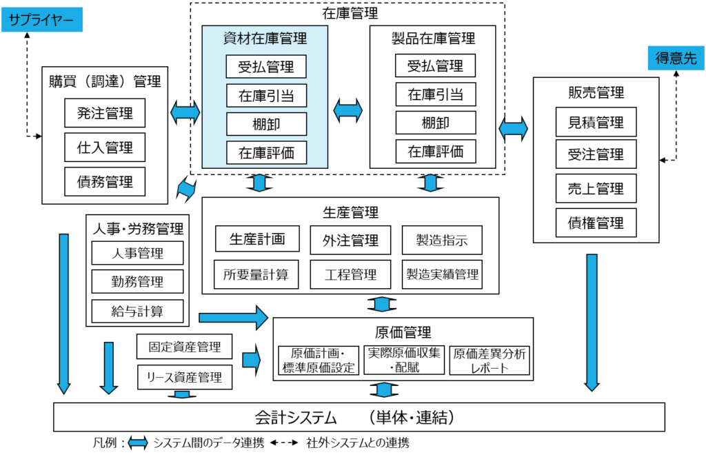 資材在庫システムは、購買管理システム、生産管理システムと強く連携しています。発注処理を行い、受入・検収処理によって資材在庫が増加しますが、購買管理システムの仕入管理と連携します。