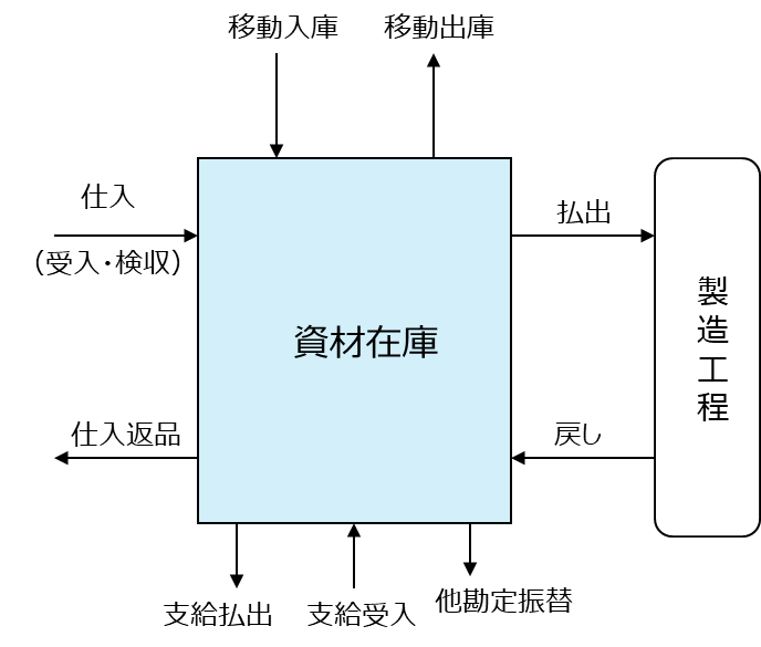 上記の仕入・仕入返品、外注先との支給による受払、製造払出・もどしの他には、社内の工場間、倉庫間移動にともなう入出庫、さらに廃棄や研究開発などの特定目的のための振替処理(他勘定振替)等があります。