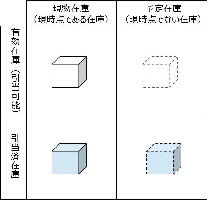 さて、ある時点の現物在庫と予定在庫、引当済み在庫と有効在庫の4つの在庫を整理すると次のようになります。予定在庫は、現時点ではないが、ある時点で在庫となるものを示しています。