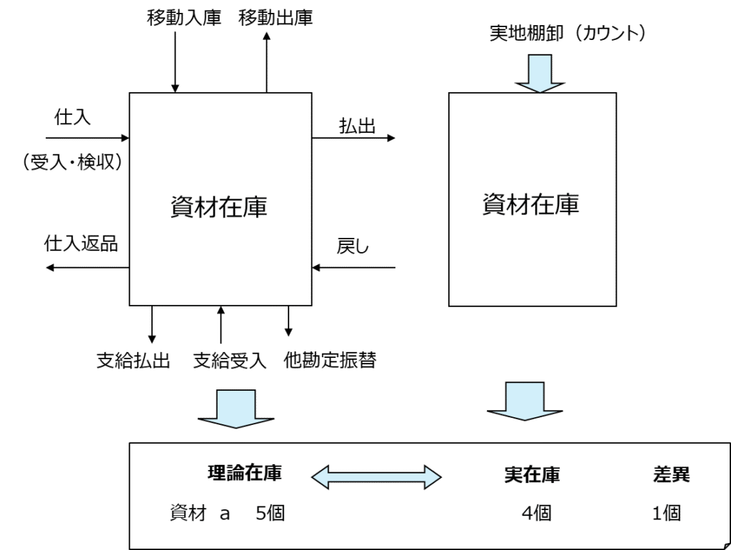 実地棚卸と帳簿在庫(理論在庫)との差の把握については、実地棚卸結果と受払による帳簿在庫(理論在庫)とをシステムで突合し、棚卸差異表の出力を行います。